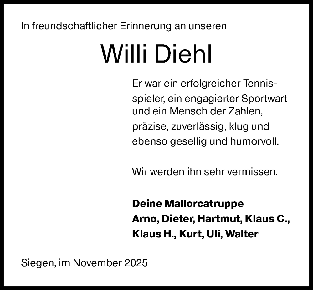 Hier finden Sie alle Traueranzeigen aus der Zeitung, die bisher für Willi Diehl erschienen sind. Weitere Traueranzeigen, die in der Zeitung erscheinen, werden hier ebenfalls aufgelistet