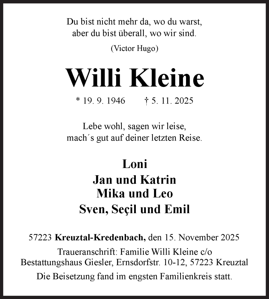 Hier finden Sie alle Traueranzeigen aus der Zeitung, die bisher für Willi Kleine erschienen sind. Weitere Traueranzeigen, die in der Zeitung erscheinen, werden hier ebenfalls aufgelistet