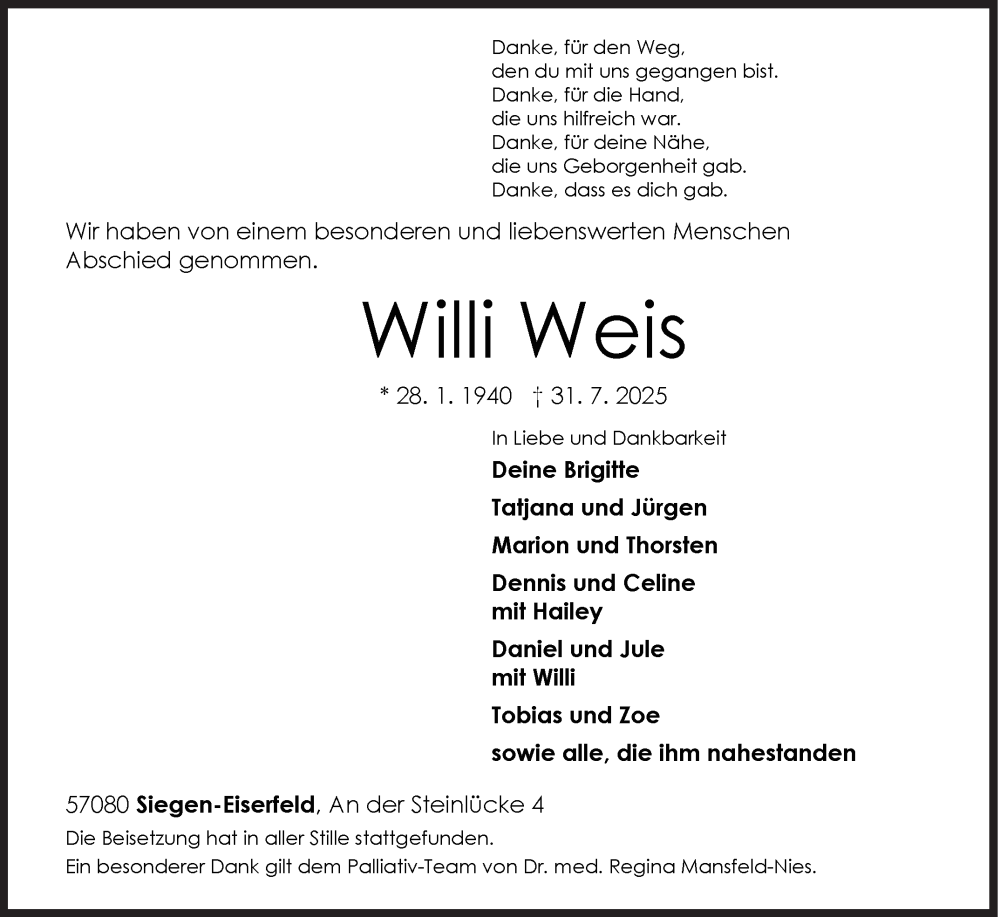 Hier finden Sie alle Traueranzeigen aus der Zeitung, die bisher für Willi Weis erschienen sind. Weitere Traueranzeigen, die in der Zeitung erscheinen, werden hier ebenfalls aufgelistet