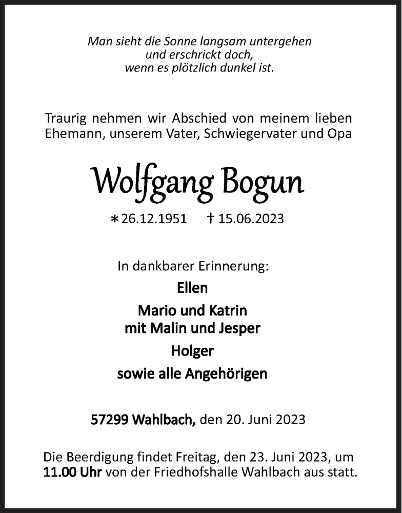 Hier finden Sie alle Traueranzeigen aus der Zeitung, die bisher für Wolfgang Bogun erschienen sind. Weitere Traueranzeigen, die in der Zeitung erscheinen, werden hier ebenfalls aufgelistet