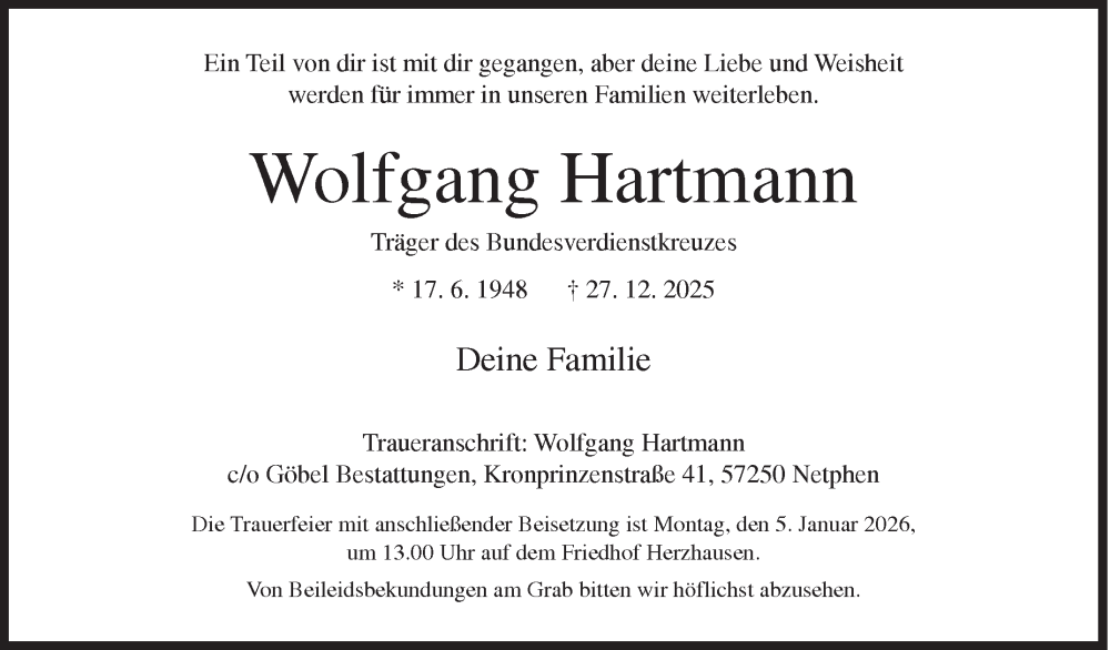 Hier finden Sie alle Traueranzeigen aus der Zeitung, die bisher für Wolfgang Hartmann erschienen sind. Weitere Traueranzeigen, die in der Zeitung erscheinen, werden hier ebenfalls aufgelistet
