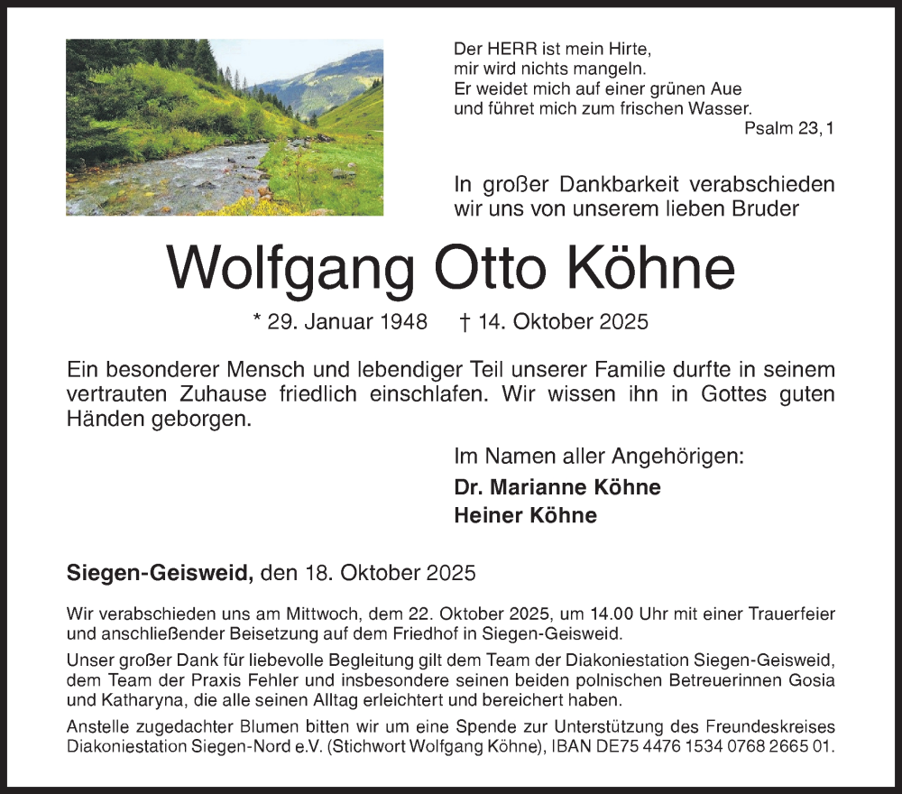 Hier finden Sie alle Traueranzeigen aus der Zeitung, die bisher für Wolfgang Otto Köhne erschienen sind. Weitere Traueranzeigen, die in der Zeitung erscheinen, werden hier ebenfalls aufgelistet